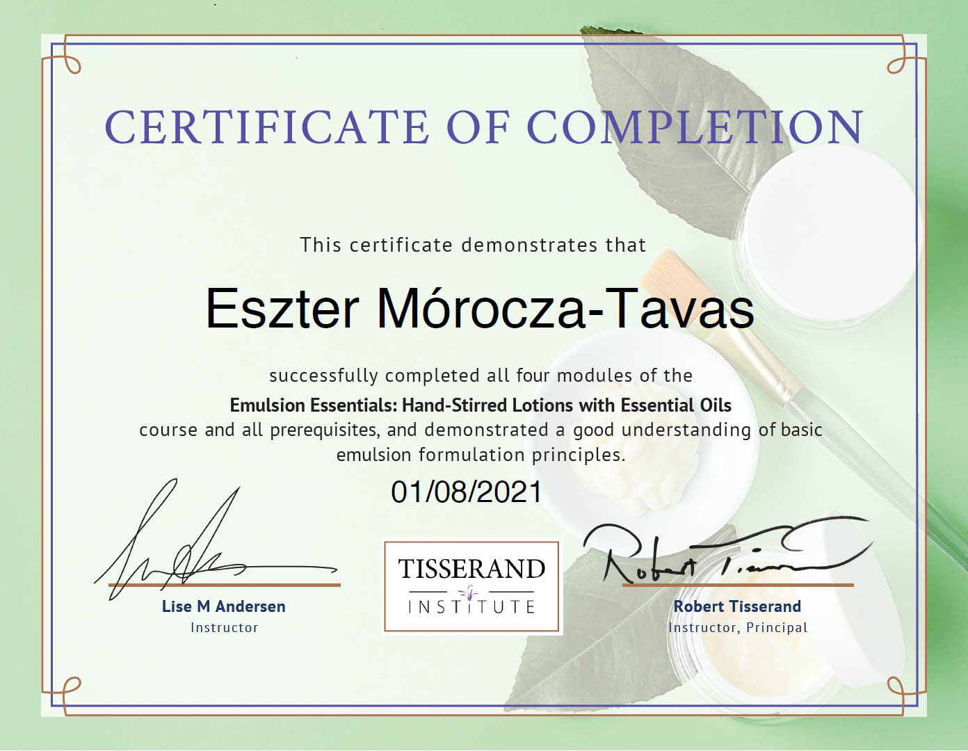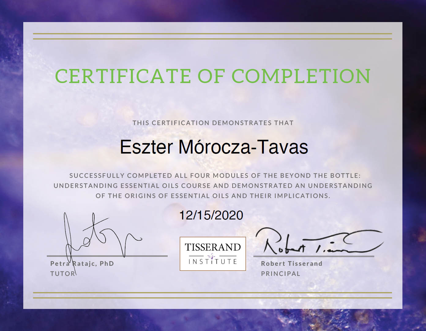 Végzettségemet tekintve megszereztem a természetgyógyász-fitoterapeuta oklevelet, aromaterápia tanulmányaimat az amerikai Tisserand Intézetben végeztem.